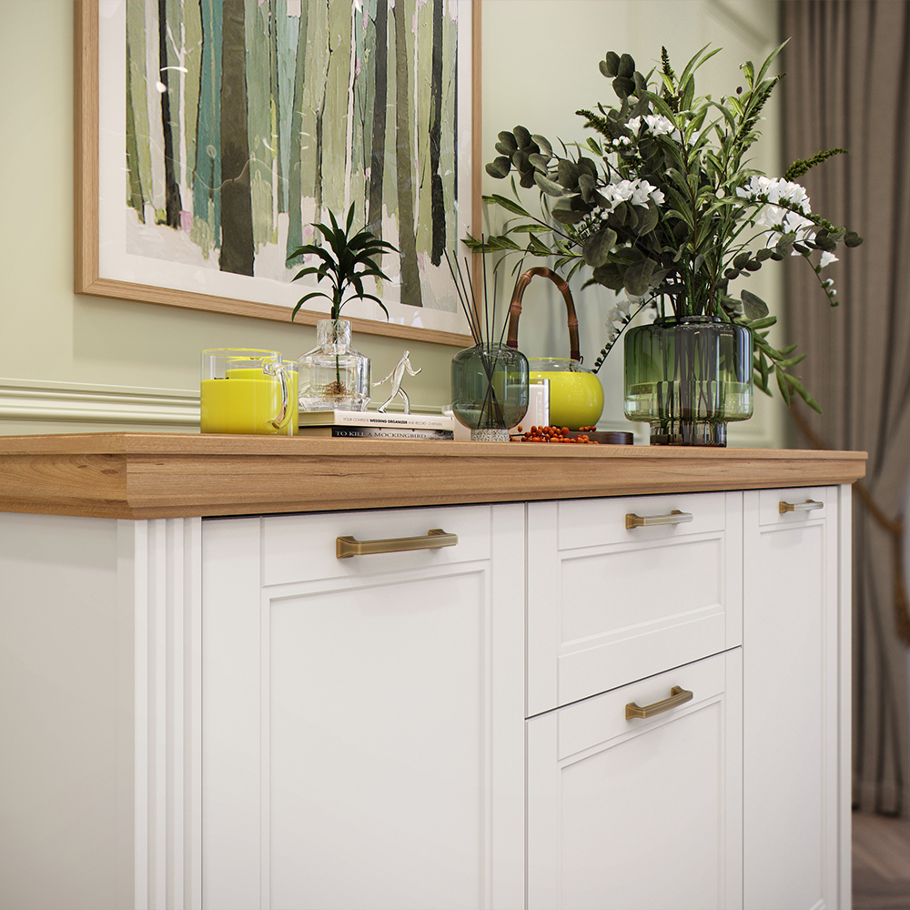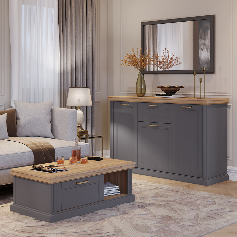 • frontovi komode su od rezbarenog medijapana lakiranog UV lakom sa soft mat efektom u grafit ili beloj boji, a dekorativna masivna pokrivna ploča od medijapana presvučena folijom u dekoru Pacifik orah