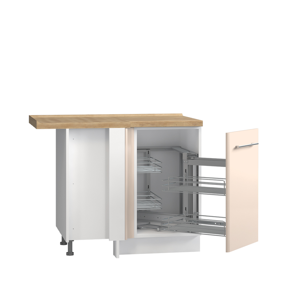 Radni ugaoni kuhinjski element sa jednim krilom i mehanizmom sa hromiranim žičanim korpama za odlaganje. Krilo se otvara na desnu stranu.