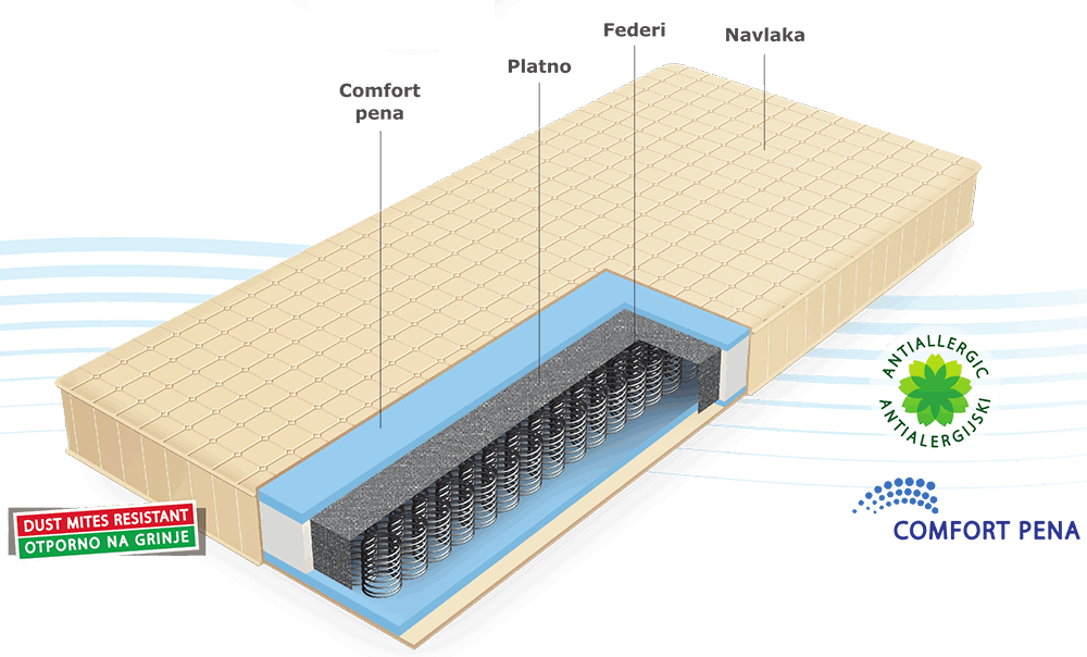 * Poliuretanska pena debljine 1 cm stavljena sa obe strane jezgra, obezbeđuje udobnost dušeka.