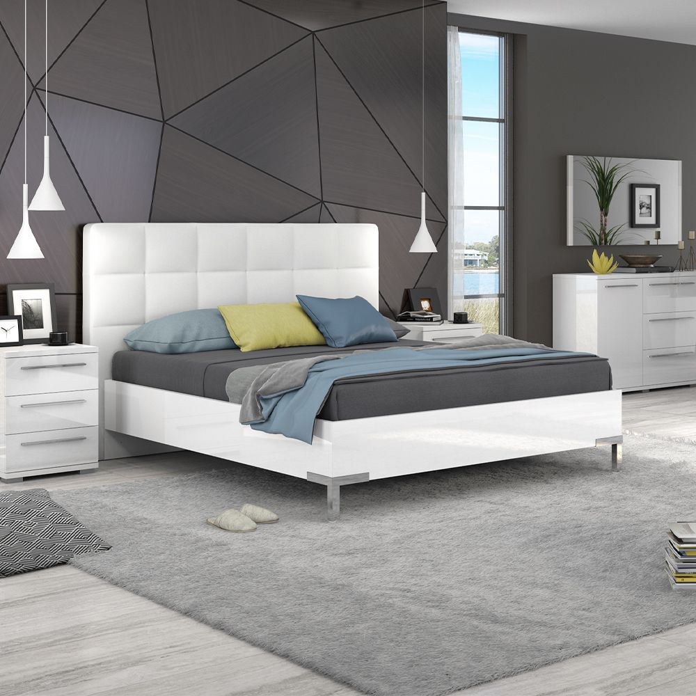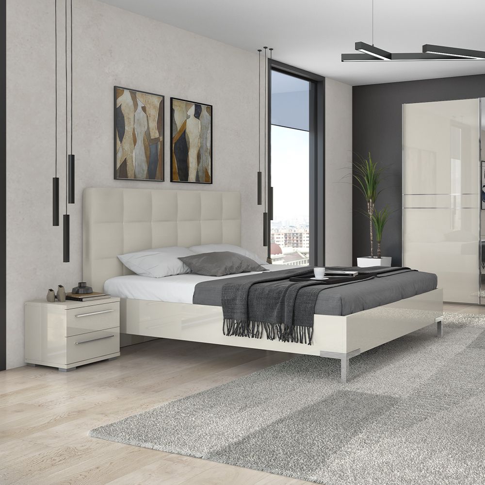 Krevet snažnog volumena sa tapaciranim uzglavljem dizajnirane geometrijske