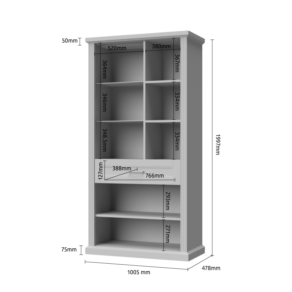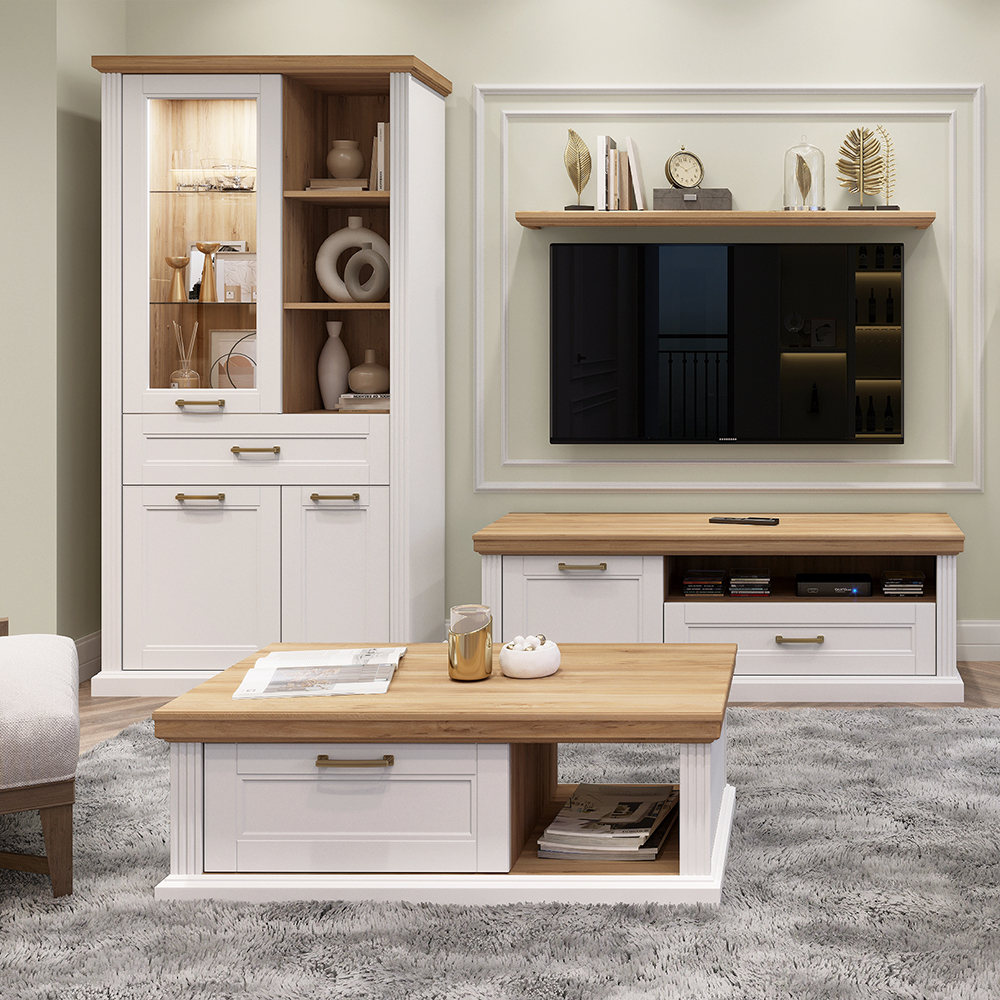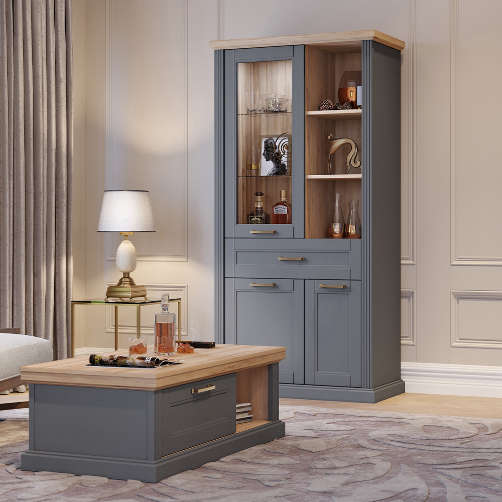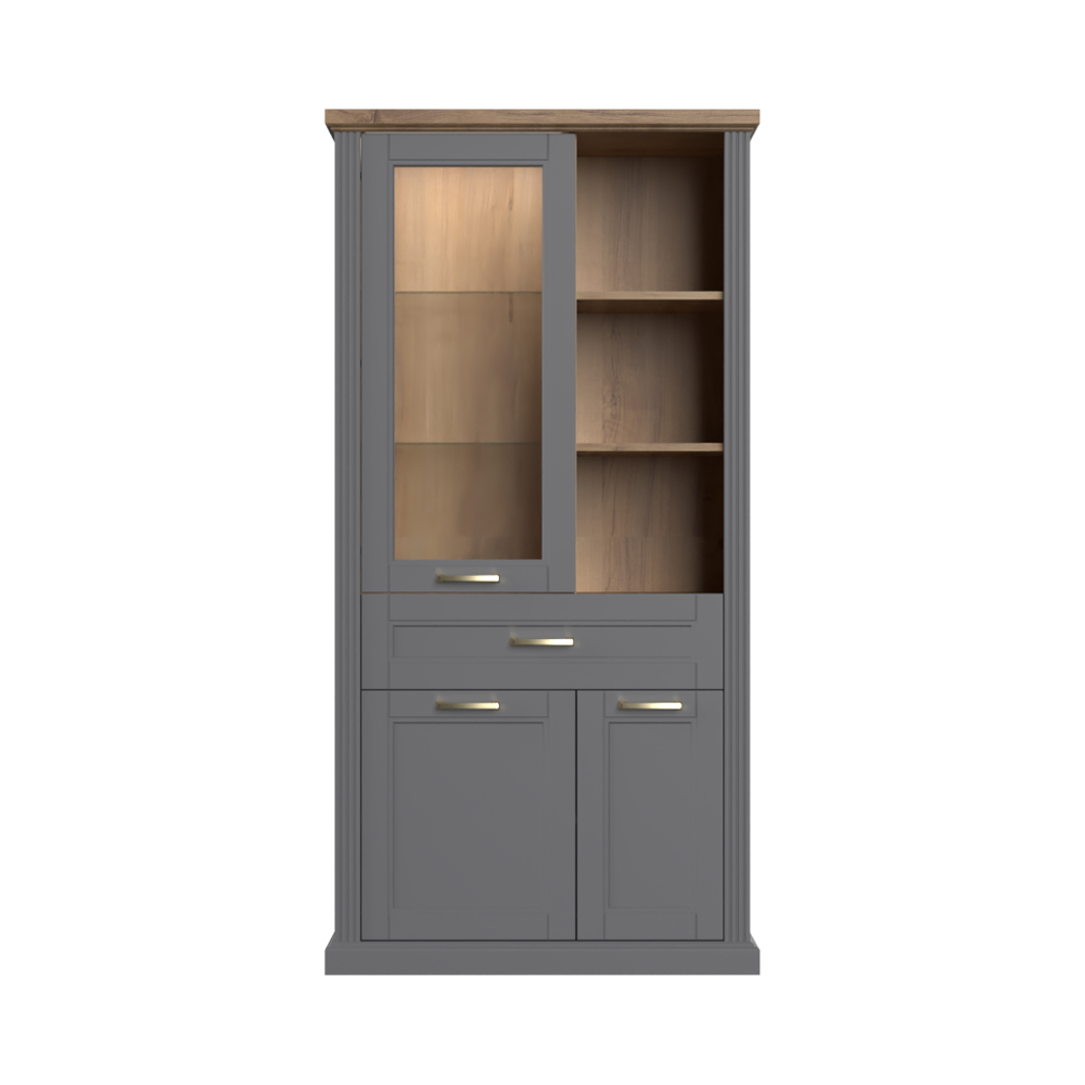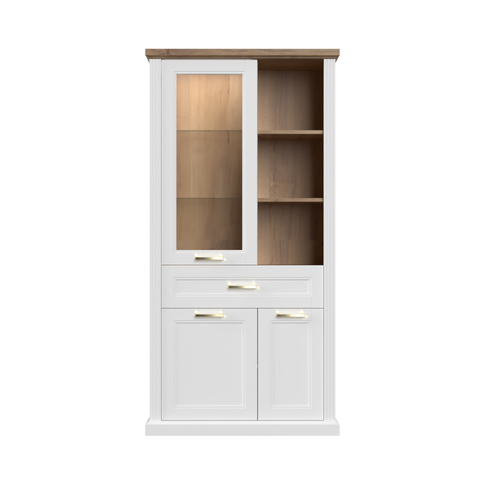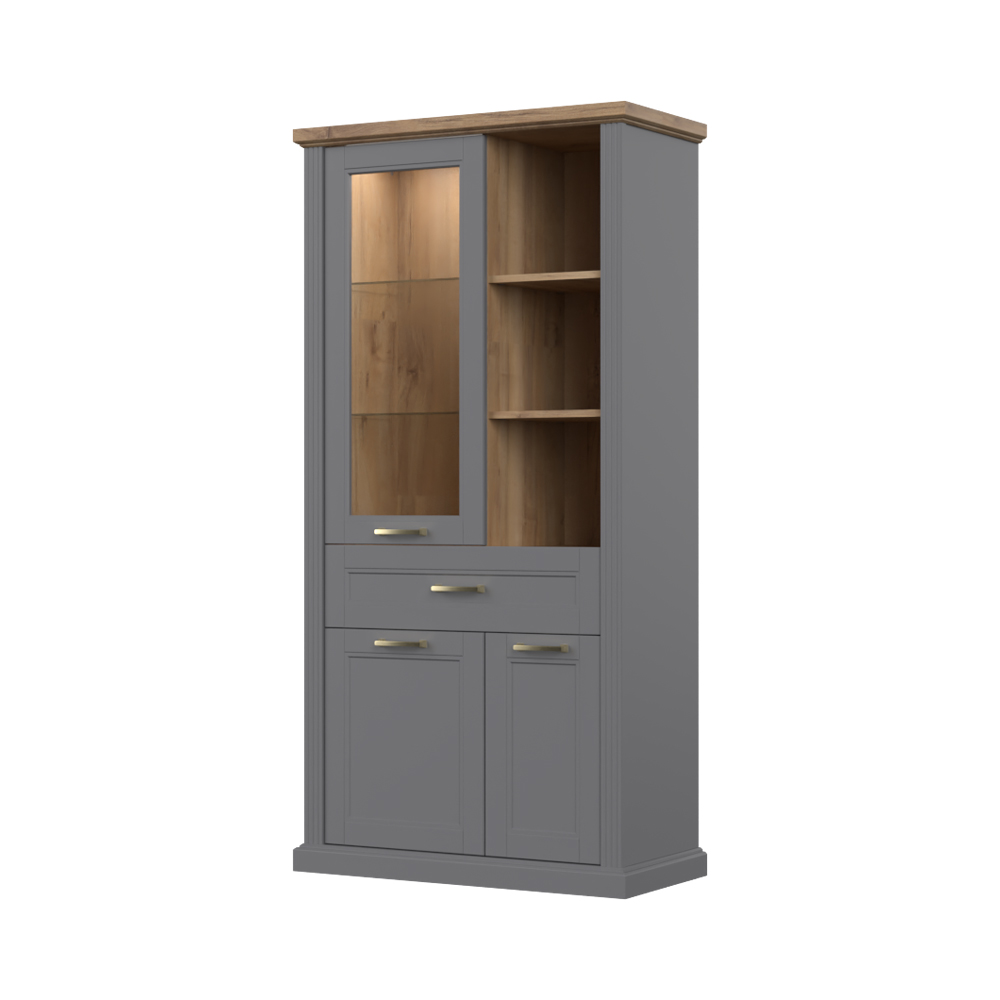 Luksuzna vitrina iz kolekcije TARA sa tri krila, fiokom i otvorenim policama.