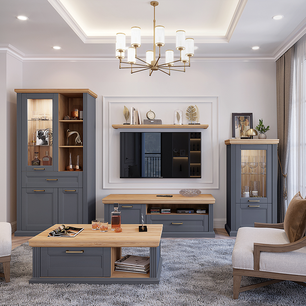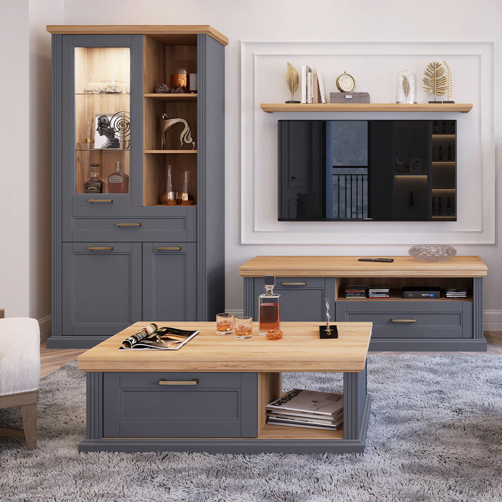 - front vitrine je od rezbarenog medijapana lakiranog UV lakom sa soft mat efektom u grafit ili beloj boji, a dekorativna masivna pokrivna ploča od medijapana presvučena folijom u dekoru Pacifik orah